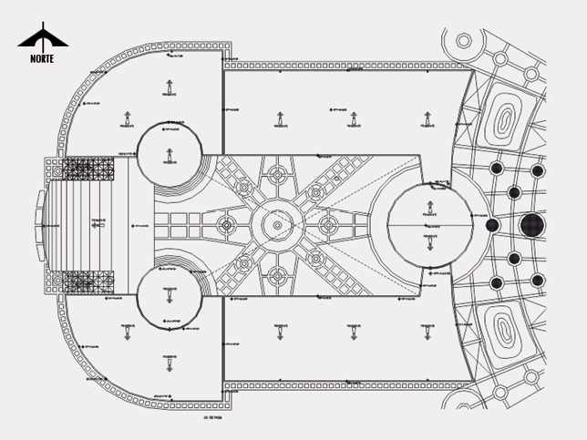 • Esquema compositivo general de organización radial, dando como resultado algunos espacios cuyo desarrollo conformó, en planta, trapezoides o secciones semicirculares; destacan las geometrías cilíndricas en Arquitectura y Artes Plásticas;