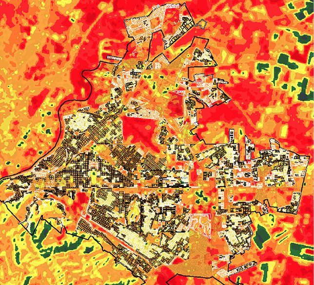En la imagen térmica (Figura 3) puede observarse la ciudad de Torreón y el gradiente de temperatura para sus diferentes zonas. Si bien en la parte norte aparecen las zonas en color rojo más representativas, estás son de los espacios que rodean la ciudad, en la superficie edificada de la ciudad, la zona con mayor afectación es el sur de ésta, por lo que se determinó que todos los casos analizados serían de la zona sur de la ciudad.