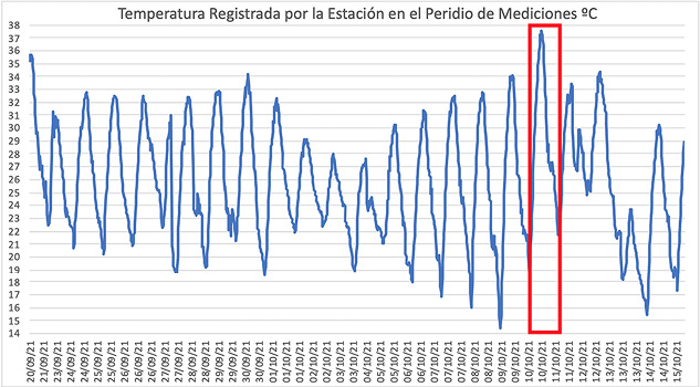 El día seleccionado para realizar el análisis comparativo fue el 10 de octubre del año 2021. En la Figura 4b se observa la temperatura y la humedad en el día seleccionado para el análisis. La humedad relativa máxima registrada fue de 52% y la mínima de 14%. La temperatura máxima registrada por la estación fue de 37.5 ºC. y la mínima de 18.9 ºC.