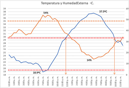 En este gráfico se marcan los parámetros de confort adaptativos determinados de acuerdo con los datos climáticos de la región en líneas punteadas en color rojo se indican el parámetro de confort mínimo de 19. 6º C. y el parámetro máximo de 29.7º C. La temperatura estuvo fuera del rango de confort máximo desde las 11:30 am hasta las 9:30 am. En línea naranja se marca la temperatura media máxima de acuerdo con las normales climatológicas. La temperatura máxima para este día fue de 37.5º C. y la minina de 18.9º C. La humedad relativa estuvo entre 14% y 54%.