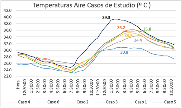 Figura 7. Temperaturas registradas en todos los casos de estudio en el día seleccionado. Fuente: elaboración propia, 2022.