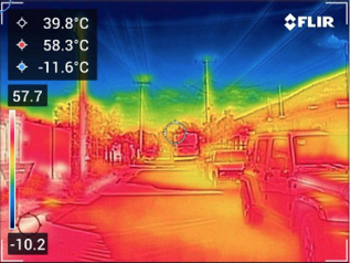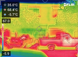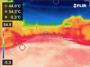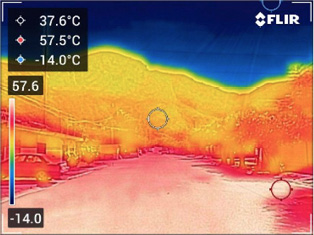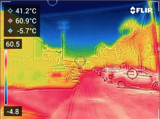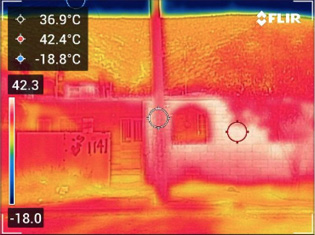 Si se comparan las temperaturas superficiales de las fotografías termográficas con los valores de las temperaturas de las imágenes térmicas de satélite, se puede percibir que hay coincidencias de valores entre éstas (todas las imágenes de las secciones frente a las viviendas quedaron en el rango más alto del gradiente, que es de entre 54 ºC y 61 ºC (Figura 10).