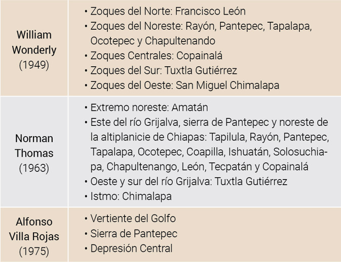 Figura 3. Propuestas de regionalización de los zoques de Chiapas.