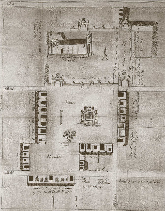 En 1815 se realizó un croquis del centro de la villa (Figura 4), “el original se conserva en el Archivo Histórico Diocesano de San Cristóbal de Las Casas, con el registro Tuxtla, iv.C.4, sin foja, 1809-1818 siendo el primer documento gráfico para toda la ciudad”,32 el cual muestra la conservación de la urbanización novohispana, pues ilustra al templo, el cabildo, los portales, una fuente y la ceiba ceremonial.