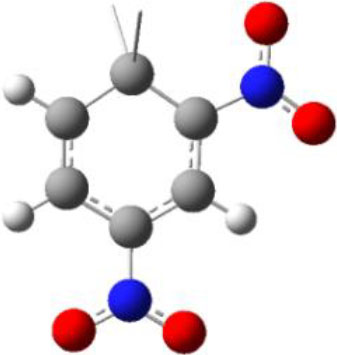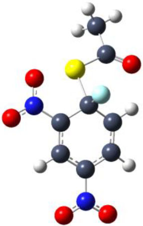 Durante el proceso de modelado deberá considerarse que al armar los intermedios de Meisenheimer habrá que modificar la hibridización del carbono electrofílico que pasa a ser de sp2 en el sustrato a sp3 en el intermedio. Para ello hay que insertar una valencia extra en el carbono aromático del sustrato, unir el anión sobre esta valencia añadida y por último configurar el anillo bencénico correspondiente un sistema tipo ciclopentadienílico, empleando la herramienta que modifica los tipos de enlace en el anillo bencénico. Es decir sobre el átomo de carbono aromático que ocurre la sustitución nucleofílica hay que cambiar los enlaces con los otros dos átomos de carbono contiguos en el anillo bencénico cuyo orden de enlace=1,5 en el sustrato (hibridización sp2) debe pasar a un orden de enlace=1 en el intermedio (hibridización sp3).