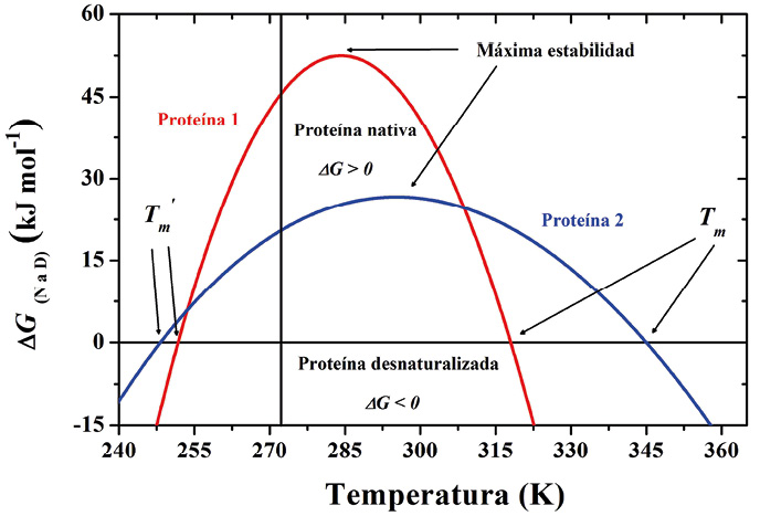 La curva de estabilidad en la figura 2 delimita el rango de temperatura en el cual el estado nativo es estable; esto ocurre a las temperaturas donde ΔG > 0 y por tanto la desnaturalización es no espontánea. La temperatura a la cual el valor de ΔG es máximo se conoce como la temperatura de máxima estabilidad. Fuera de ese intervalo ΔG < 0, la desnaturalización es espontánea y el estado estable es el desnaturalizado D. La figura 2 también muestra que hay dos temperaturas (Tm y Tm') a las cuales ΔG = 0. Coloquialmente, la Tm se conoce como la temperatura de desnaturalización "por calor", mientras que Tm' representa la temperatura de desnaturalización "por frío". Es importante aclarar que, como se verá más adelante, las proteínas no se desnaturalizan a una sola temperatura sino en un intervalo de temperaturas. Para la mayor parte de las proteínas no es posible medir experimentalmente su Tm' ya que esta es menor a la temperatura de congelación del medio acuoso (aproximadamente 273.15 K).