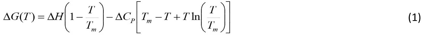 donde ΔH y ΔCp son los cambios de entalpía y de capacidad calorífica a presión constante para el proceso de desnaturalización (N → D) y Tm es la temperatura de referencia, en la cual la concentración de N y D es la misma (por lo tanto, ΔG(Tm ) = 0 a la Tm). A la representación gráfica de ΔG v.s. T empleando la Eq. (1), se le conoce como curva de estabilidad termodinámica. La figura 2 muestra esta curva para dos proteínas diferentes. Para una proteína dada, la curva de estabilidad termodinámica varía en función de las condiciones (pH, solución amortiguadora) del medio en el que se encuentra. Más importante aún es que la curva de estabilidad en la figura 2 es diferente para cada proteína, y puede considerarse como una suerte de "huella termodinámica" que la distingue de todas las demás.