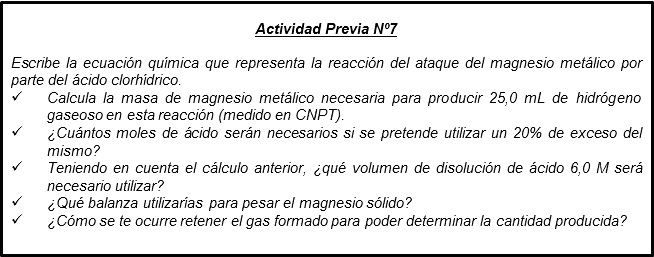 En la Figura 3 se presenta la actividad previa correspondiente al TP de Obtención de hidrógeno gaseoso que se realiza avanzado el cursado de la asignatura. Los alumnos ya se han familiarizado con las expresiones de concentración de las disoluciones, los cálculos estequiométricos, los conceptos de pureza, rendimiento y reactivo limitante. En esta oportunidad deben abordar el manejo de un producto gaseoso y su cuantificación. Durante la discusión de la actividad se progresa en aplicar criterios para el diseño experimental relacionados con la estequiometría de la reacción y la posibilidad de medir la cantidad de producto obtenido con determinada precisión.