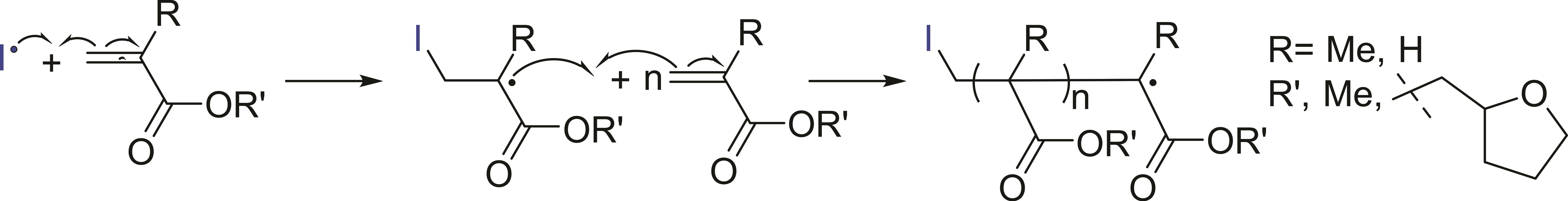 Los ésteres de los ácidos acrílico y metacrílico también pueden ser usados como materiales adhesivos y comúnmente se les conoce como adhesivos acrílicos. Durante el proceso de curado estos adhesivos sufren una reacción de polimerización en cadena vía radicales libres (véase el Esquema 3). En la reacción de polimerización los monómeros acrílicos reaccionan entre sí formando nuevos enlaces C-C mediante la ruptura homolítica de los enlaces C=C de los monómeros. La formación de nuevos enlaces C-C permite crear la unión de dos superficies mediante el adhesivo (Abbey & Zalucha, 2017).