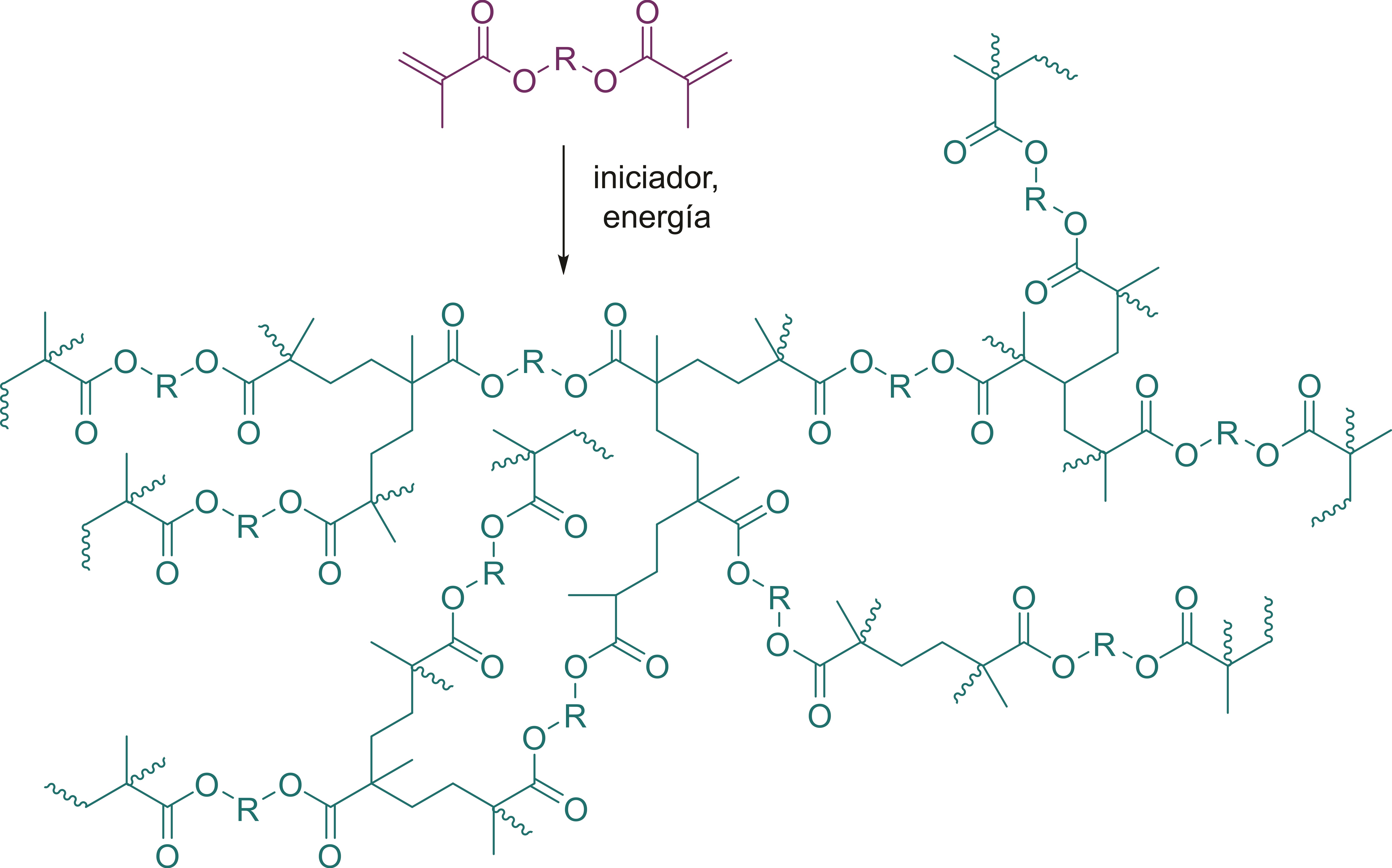Si el monómero empleado contiene dos o más ésteres acrílicos o metacrílicos en su estructura la polimerización dará como producto una red entrecruzada (Esquema 4). La formación de la red entrecruzada mejora las propiedades mecánicas (resistencia a la deformación cuando se aplica una fuerza externa), la estabilidad química (resistencia al ataque por otra sustancia química) y térmica de la unión (resistencia a la descomposición a temperaturas elevadas).