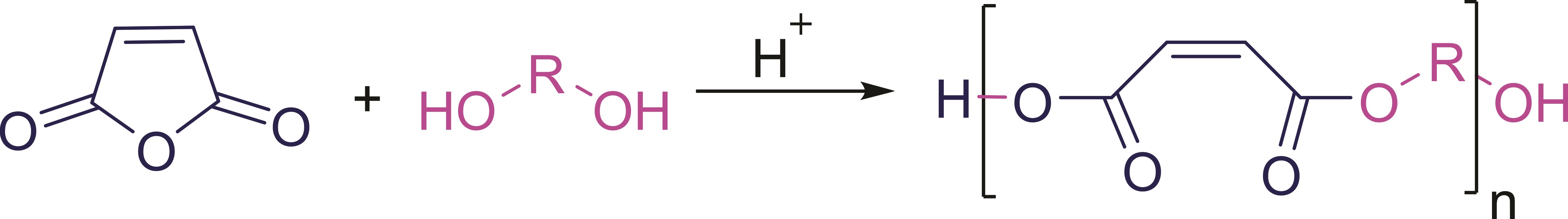 Las reacciones de polimerización en cadena vía radicales libres también son observadas en las resinas de poliéster insaturado. Estos adhesivos consisten en un poliéster que contiene grupos C=C en la cadena polimérica y un monómero. El poliéster se denomina insaturado porque contiene enlaces C=C dentro de la cadena principal y comúnmente se obtiene mediante la polimerización del anhídrido maleico con un glicol como se muestra en el Esquema 5. (Issam, Hena, & Nurul Khizrien, 2012).