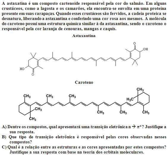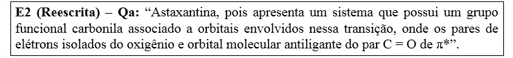 Analisando a resposta de E2 nota-se que a escolha pelo caroteno não está correta, assim como sua explicação, pois tomando a interpretação das estruturas químicas, apenas a astaxantina possui grupos oxigenados ligados a um dos anéis. Sabe-se que os átomos de oxigênio quando em ligações químicas apresentam pares de elétrons livres – apesar de não estar presente na representação indicada – que são passíveis de sofrer transição eletrônica (n → π*) quando são excitados por radiação ultravioleta (ou visível).
