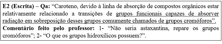 Em uma análise mais pontual, o primeiro comentário é mais direto, assinalando qual seria a substância e dando foco na visualização da estrutura química, ou seja, no reconhecimento da normatividade. Entende-se que tal orientação permite ao estudante apropriar da rede de significados do saber, devido ao aluno não ter relacionado o grupo cromóforo com a transição eletrônica do tipo n à π*.
