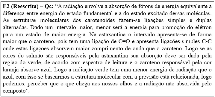 Na reescrita E2 foca somente no terceiro comentário (foco da questão), pois além de ser uma resposta totalmente diferente da escrita, há um direcionamento para a relação entre a conjugação presente na estrutura química e coloração (parte grifada) que é realmente o eixo central da questão. Isso demonstra que o aluno conseguiu interpretar os comentários e canalizar no questionamento central, pois a extensa conjugação em estruturas químicas faz com que a quantidade de energia absorvida para provocar as transições eletrônicas seja menor, e portanto, aumenta o comprimento de onda para a região do visível.