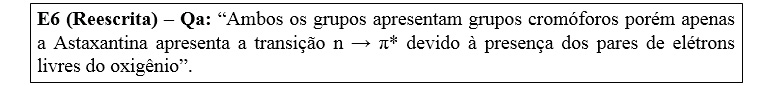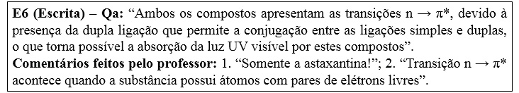 Analisando a resposta de E6 percebe-se que ainda não ocorreu a apropriação conceitual, uma vez que a resposta afirma que ambos os compostos apresentam transições n à π*. Isso é mostrado pela estudante ao escrever que as duplas ligações (grupos cromóforos) permitem a conjugação entre ligações simples e duplas (correspondente à transição π à π*) e não em relação os elétrons livres no átomo de oxigênio nos grupos de C=O e –OH presentes na estrutura química da astaxantina.