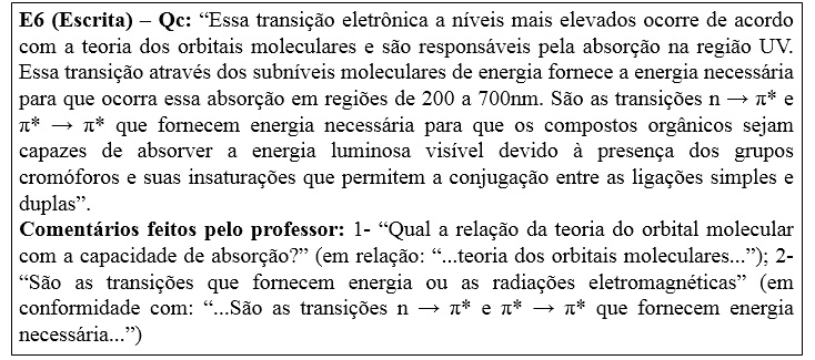 Os dois comentários não são questionadores, mas diretos e voltados tanto para normatividade como para a rede de significados do conhecimento, pois o professor aponta qual é a substância correta sem explicitar ao estudante a correlação entre o grupo cromóforo com a possível transição eletrônica. Isso porque, pela escrita, nota-se uma apropriação conceitual do saber grupo cromóforo, porém a dificuldade está na conexão desse saber com o saber da transição eletrônica que evidencia a evolução conceitual. Desta forma, na reescrita, E6 buscou estabelecer a relação científica entre os dois saberes com suas próprias palavras, mesmo o comentário do professor fornecendo praticamente a resposta: