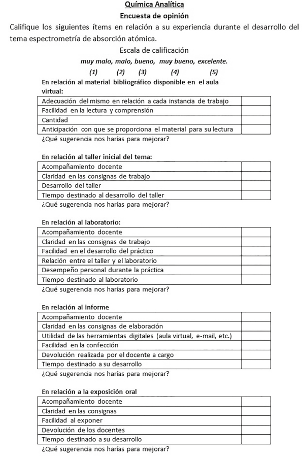 El taller inicial tuvo como finalidad abordar y revisar, con la guía del docente, conceptos teóricos y prácticos del tema mediante la articulación con contenidos adquiridos previamente. En el aula virtual de la materia los alumnos contaron con anticipación (una semana) con el material bibliográfico necesario que consistió en una selección de contenidos teóricos de la técnica de espectrometría de absorción atómica, artículos de revistas relacionados y una guía orientadora de los ítems centrales a tratar en el taller (figura 1). También se incluyeron enlaces a diferentes páginas de organismos oficiales donde los alumnos encontraron normativas sobre niveles máximos permitidos de los analitos a determinar. El encuentro finalizó con la elaboración conjunta docente–alumno de un protocolo de trabajo para el desarrollo del laboratorio.