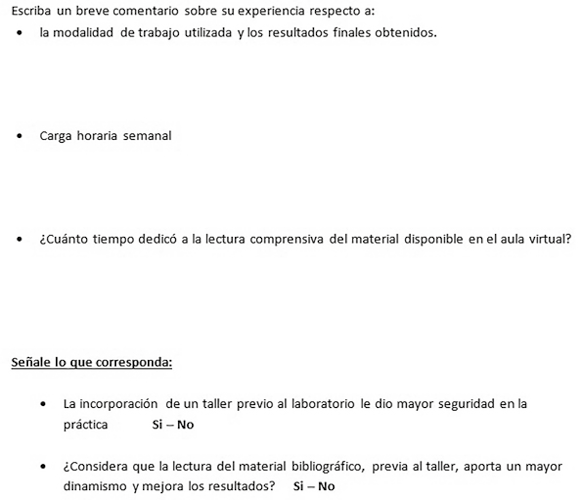 Consideramos que, como no todos los alumnos cuentan con las herramientas cognitivas y metodológicas necesarias para analizar y seleccionar la información de interés de un conjunto de contenidos, es necesario que el docente guíe la lectura a través de cuestionarios o preguntas pautadas a fin de maximizar los resultados obtenidos y lograr un mayor aprovechamiento del poco tiempo que los alumnos invierten en la lectura (García Hernández y De la Cruz Blanco, 2014). Esto se vio reflejado en las opiniones personales de los alumnos sobre la modalidad de trabajo utilizada, ya que todos coincidieron en que la incorporación de un cuestionario para completar, antes de la instancia presencial (figura 1), fue fundamental para guiar la lectura comprensiva y centrar la atención en los temas más relevantes y mejorar la ubicación en el tema por desarrollar.