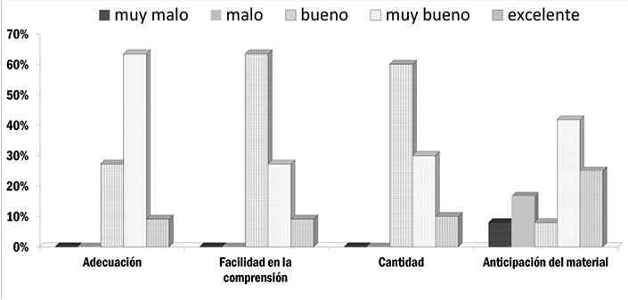 En cuanto a la facilidad en la lectura y en la comprensión del material, el 91% de los alumnos lo calificaron como buena o muy buena, encontrando mayor dificultad de análisis en los textos en inglés debido a la necesidad de realizar una traducción previa.