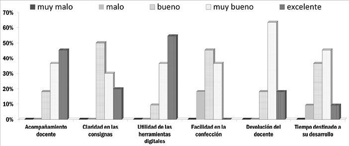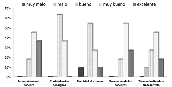Se observa que el 99% de los alumnos valoraron el rol del docente en esta instancia como muy bueno a excelente. El 82% de los alumnos calificó de muy buenas y excelentes las consignas trabajadas respecto a su claridad, el mismo porcentaje calificó como muy bueno y excelente el desarrollo del taller, solo el 45% del alumnado consideró como bueno el tiempo destinado al desarrollo del mismo, expresando que se requeriría un tiempo mayor.