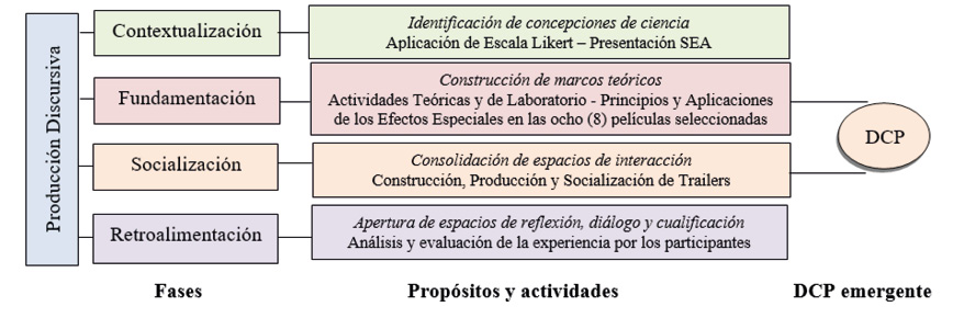 Posteriormente, se aplicó un test para identificar concepciones de ciencia. En la figura 2, se muestra la estructura de la SEA implementada en lo que se refiere a sus fases, propósitos y actividades, donde se esperaba emergieran discursos de naturaleza científica, para caracterizar el DCP.