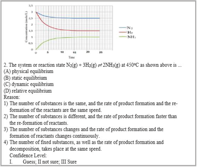 Yang & Sianturi (2019), Arslan et al. (2012), and Hasan et al. (1999) used the three-tier instrument to classify students’ conceptual understanding into three categories, namely, (1) scientific knowledge, (2) misconceptions, and (3) insufficient opinions. The first category belonged to those having correct answers in their answer (first-tier) and reasonings (second-tier) and was also sure about their responses (third-tier). The second category divided into three subcategories, that is, specific misconceptions (incorrect answers, wrong reasons, sure), false-negatives (correct answers, incorrect reasons, sure), and false-positive (incorrect answer, correct reasons, sure). The third category covered students with wrong answers as well as reasonings and was only do guessing when performing the test. The three-tier instrument has been shown in some fields but is still absent from the topic of Chemical Equilibrium (CE). This research is intended to develop a valid and reliable three-tier diagnostic instrument on the topic of Chemical Equilibrium abbreviated with TT-DICE.