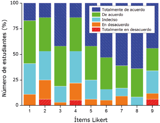 La encuesta se diseñó a partir de la literatura (Shibley y Zimmar, 2002; Richter-Egger, Hagen, Laquer, Grandgenett y Duncan, 2010; Priest, Pyke y Williamson, 2014) y está compuesta de 9 ítems con cinco niveles de respuesta: totalmente en desacuerdo (1), en desacuerdo (2), indecisión (3), de acuerdo (4), totalmente de acuerdo (5). Por tanto, a mayor puntación la valoración sería más positiva y favorable. Sin embargo, aunque la escala Likert es muy utilizada para poder analizar datos de manera cuantitativa, también presenta una serie de limitaciones como, por ejemplo, el hecho de considerar que todos los ítems miden con la misma intensidad lo que se desea medir o que no permite obtener una medida exacta de la valoración hacia un tema concreto, sino que sólo permite conocer si la valoración hacia cierta aseveración es o no favorable (Cañadas y Sánchez, 1998). Por tanto, para obtener más información, se plantearon varias preguntas abiertas: ¿Qué es lo que más te ha gustado? ¿Y lo que menos? ¿Qué mejorarías o cambiarías? Finalmente, se incluyó una lista de adjetivos, adaptada de la literatura (Galloway, Malakpa, y Lowery, 2016), de tal manera que los estudiantes tuvieran que señalar con un círculo aquellos que describiesen mejor su experiencia personal durante el desarrollo de la unidad, siguiendo un enfoque de clase invertida y, por tanto, teniendo en cuenta las fases de trabajo en casa (aprendizaje individual) y trabajo en el aula (aprendizaje grupal), y tachar aquellos otros que no la hubieran descrito. En la Figura 2 se ilustran los porcentajes de respuesta obtenidos para todos los ítems del cuestionario.
