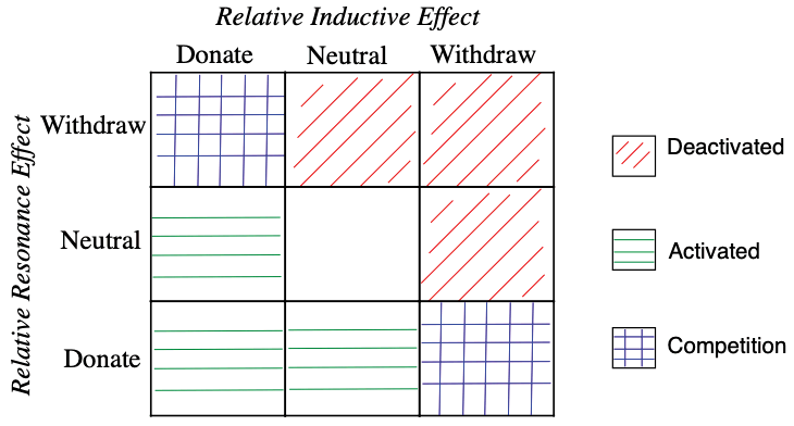 As Gould noted “when the I (inductive) and R (resonance) effects of a substituent are in opposite directions we cannot predict, in the absence of further information, whether that substituent will activate or deactivate the ring” (Gould, 1959). To facilitate this prediction, the substituents with competing effects might be classified in extended version of the effects (Figure 14). One might further divide the lower right-hand corner into three subsets: those that donate greater than their withdrawal, those that withdraw greater than their donation and those for which induction and resonance are almost balanced.
