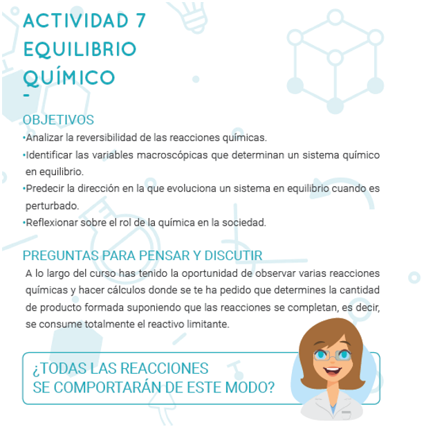 Estas actividades poseen un diseño gráfico especialmente realizado por diseñadoras en comunicación visual a los efectos de agradar a la vista e incentivar la lectura. A modo de ejemplo, en las Figuras 1 y 2 se muestra el material propuesto para comenzar a trabajar el concepto de Equilibrio Químico. En la Figura 1 se observan los objetivos de la unidad y algunas preguntas para abrir el debate sobre el tema. En la Figura 2 se muestran extractos de la lectura propuesta. En este caso, para el tema Equilibrio Químico, se buscó una lectura con contenido histórico que, además de trabajar los conceptos fundamentales, nos permite reflexionar y debatir sobre el rol de la ciencia en la sociedad. Para otros temas se eligieron lecturas vinculadas a avances científicos y tecnológicos recientes.