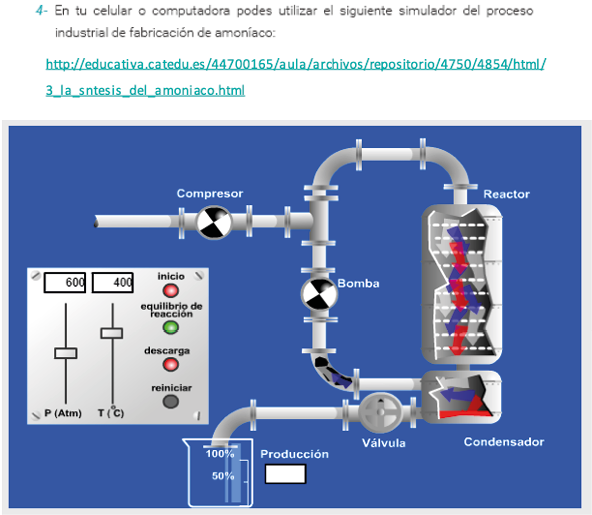 Para trabajar algunos contenidos se propone el uso de simulaciones de acceso libre. A modo de ejemplo en las Figuras 3 y 4 se muestra una actividad planteada para introducir el Principio de Le Chatelier en la unidad de Equillibrio Químico. En la Figura 3 se observa una imagen del simulador donde es posible modificar las variables operativas para el proceso de Haber Bosch para la obtención de amoníaco. En la Figura 4 se muestran las actividades propuestas con el simulador que inducirían a la observación de cómo responde un sistema, inicialmente en equilibrio, cuando algunas de sus variables son modificadas. Experiencias similares han sido utilizadas en otros niveles educativos con buenos resultados (Valdéz, 2017). Se ha reportado que, a nivel universitario, los estudiantes reconocen a las TIC como una herramienta útil para mejorar la elaboración de trabajos, la organización de su actividad académica, las tareas de repaso, las actividades con compañeros y la búsqueda de recursos. Asimismo, la utilización de estas herramientas parece mejorar las actitudes hacia el estudio, fomentando la autonomía y la autogestión de los procesos de aprendizaje (García-Valcárcel y Tejedor Tejedor, 2017).