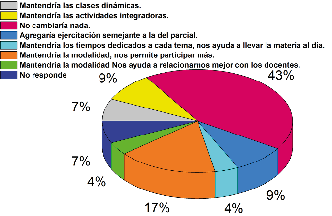 Adicionalmente, la encuesta consta de otras dos instancias en los que se solicita una comparación entre ambos cursos y sugerencias para posibles cambios. Según puede observarse en la Figura 10, la mayoría de los estudiantes manifiestan estar conformes con el CEAEQ (el 43% de los encuestados no haría cambios), valorando positivamente el acompañamiento de los docentes, la participación de los alumnos durante la clase, la dinámica de éstas y los trabajos integradores. Además, han expresado que esta metodología les ha ayudado a llevar la materia al día.