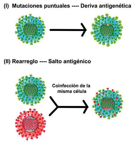 Los cambios genéticos pequeños y graduales ocasionados por mutaciones son responsables de la modificación en la afinidad y consecuente pérdida de capacidad neutralizante de los anticuerpos. Al cambiar la estructura de las proteínas que eran reconocidas por los anticuerpos, aunque sea ligeramente, los anticuerpos pueden ya no ser capaces de unirse a ellas. Este fenómeno se conoce como deriva antigénica (antigenic drift, en inglés) y es por ello que las vacunas contra la influenza no nos protegen contra las variantes que surjan en años posteriores (Figura 5).