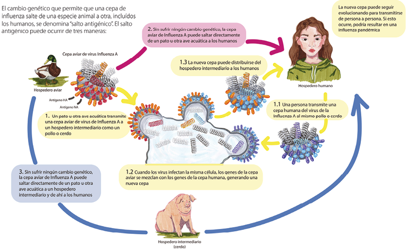 cepa aviar, una cepa porcina y una cepa humana. Ilustración de Inés Esteve