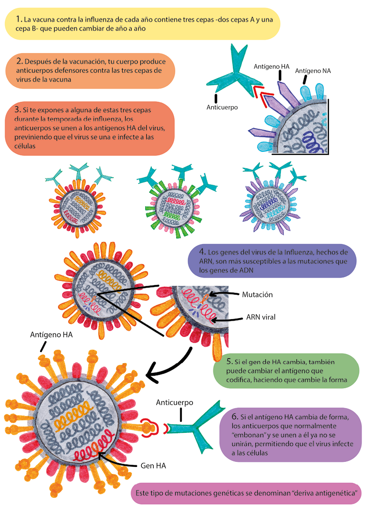 Figura 5. Mecanismo y efectos de la deriva antigénica. Ilustración de Inés Esteve