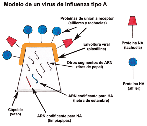 Planeación de la actividad: Se trata de llevar a cabo una secuencia didáctica de 6 horas (tres sesiones de dos horas es ideal). Las fases de la secuencia son cuatro: Preparación previa por parte del docente, actividad ancla para comprometer y motivar a los alumnos, desarrollo (análisis y elaboración de un modelo explicativo) y cierre (conclusión). La idea es modelar la cápside viral con un vaso, el cual se recubre con plastilina para representar la envoltura viral, a la cual se inserten alfileres y tachuelas que representen las proteínas clave en el reconocimiento inmunológico del virus: Hemaglutinina (HA) y Neuraminidasa (NA), mientras que el interior del vaso contenga piezas de estambre y limpiapipas que representan los segmentos de ARN que codifican para dichas proteínas. La intención es que durante la actividad se generen varias combinaciones de las proteínas presentes en el virus de la influenza y los alumnos analicen la combinación aleatoria en la que se comparten fracciones equivalentes entre tres especies animales, con lo que se generan nuevas cepas virales, por lo cual ocurre el salto antigénico y cada año se debe identificar la cepa circulante más frecuente y diseñar una vacuna contra ella.[3]