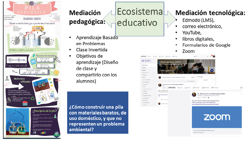 Figura 1. Se presenta el esquema del curso a partir de la idea de un “ecosistema educativo”. A la izquierda se muestra una infografía, entregada por un equipo, como uno de los productos finales del desarrollo del problema para construir una pila, que es la parte central de la mediación pedagógica.