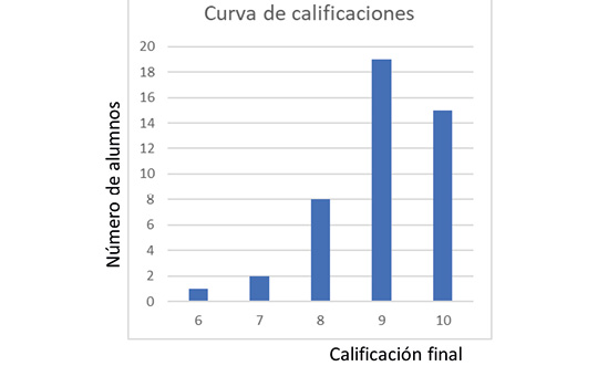 El resultado final de este forzado experimento de educación a distancia, independientemente del contexto tan penoso y difícil que lo ocasionó, fue positivo. En la Figura 3 se observa el perfil de calificaciones finales que consiguieron mis estudiantes, siendo 9 la media. Me mostró que el aprendizaje en medios virtuales puede ser tan bueno como en sistemas presenciales, incluso mejor en algunos casos. Los trabajos finales que presentaron mis estudiantes fueron de alta calidad en términos generales, incluso mejores en promedio que en cursos anteriores.