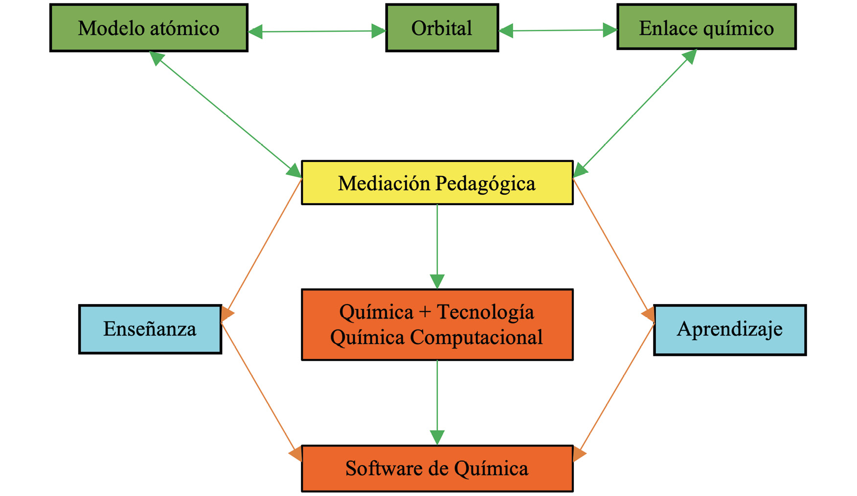 Por otro lado, muchos investigadores afirman que esta rama de las ciencias exactas nace con la necesidad de comprender aspectos importantes que no se pueden resolver de forma práctica como, por ejemplo, el análisis de sistemas en condiciones extremas de temperatura o presión, el comportamiento de materiales o el estudio de sistemas químicos que experimentalmente genera un alto costo (Valles-Sánchez et al., 2014). De esta forma, la QC resulta ser un gran método de estudio, ya que los programas de esta rama actualmente contienen los avances científicos de la disciplina de las últimas décadas, pero en cuanto a su manejo pleno, es difícil y requiere del dominio de algunos aspectos con relación a los fundamentos de la química cuántica y computacional (Bedolla y Olvera, 2009). Sin embargo, es posible su empleo limitado dentro del proceso de formación de estudiantes de secundaria, para hacer cálculos sencillos con parámetros estándar que funcionen bien, y que, en la mayoría de los casos, pueden ser llevados al aula de clase, con el fin de utilizarse como una buena herramienta didáctica (Bedolla y Olvera, 2009), debido a que, es posible emplear la QC como un modelo de mediación pedagógica que permita tanto al docente como al estudiante, mediar los diferentes procesos de enseñanza–aprendizaje a través de la química más la tecnología, por medio del uso de diferentes softwares para reforzar, ampliar e interiorizar mucho más fácil aquellos conceptos impartidos en clase que no se pueden analizar a simple vista (Figura 1).