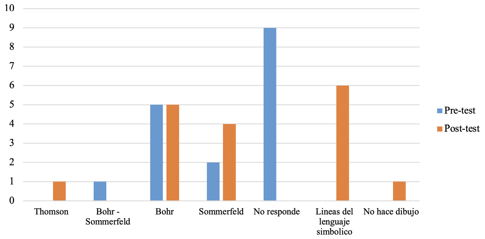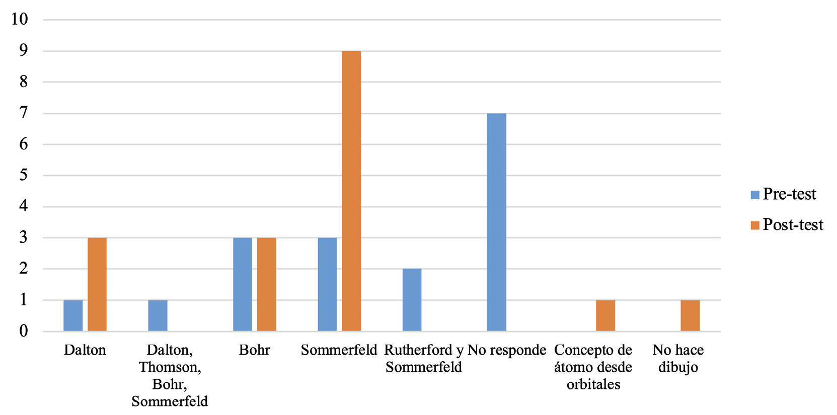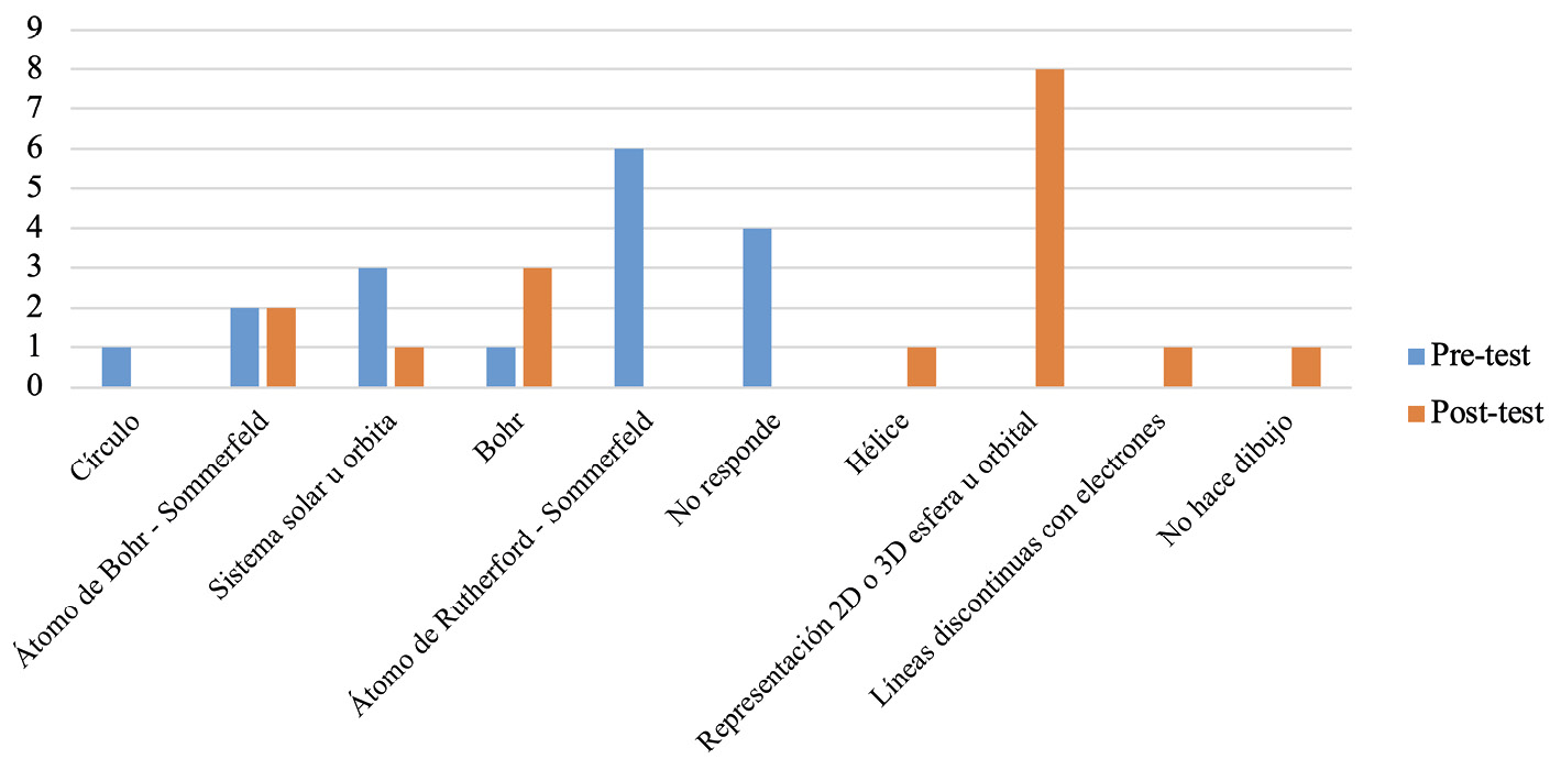 En el postest (Tabla 1), se observó un cambio en las respuestas, dado que los estudiantes elaboraron dibujos relacionados con el modelo atómico de Sommerfeld, dejando la confusión que se presentó anteriormente con el modelo de Rutherford, además se notó en algunos estudiantes, la utilización de representaciones a través del modelo de Dalton o de Bohr. De igual forma, también surgieron respuestas frente a esta pregunta, como por ejemplo, estudiantes que explicaron el concepto de átomo desde el desarrollo de un dibujo que hace alusión a los orbitales y otros que no realizan ningún tipo de representación con lo cual, se puede dar a entender una aproximación al modelo mecánico–cuántico, pero cuando se mira la explicación a dicha representación no se evidencia una justificación desde la aproximación al entendimiento a este modelo, mostrando así, una predominancia del modelo atómico de Arnold Sommerfeld y una transición progresiva hacia el concepto de átomo actual.