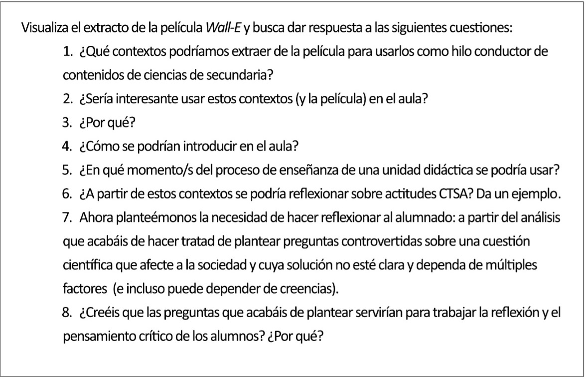 The present work depicts and analyzes a didactic proposal for pre-service teachers who use movies in a virtual learning environment. The proposal uses the film Wall-E as an educational resource that allows teachers to approach a contextualized and reflective teaching of science. The results of the didactic intervention, the pre-test post-test, and the satisfaction survey indicate that the proposal has increased teacher interest in the use of contexts through film. In addition, it has encouraged the use of CSC to promote reflection in the science classroom. However, this change in perception is not reflected in a more innovative use of these strategies in the classroom. |