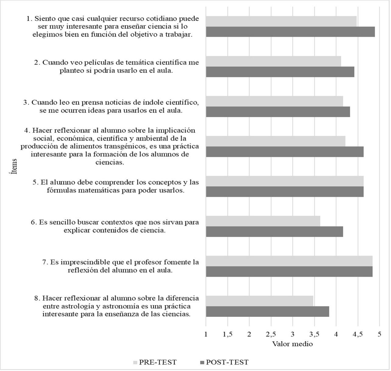 Con el fin de analizar si existe un cambio en la percepción de la utilidad de recursos cotidianos, el uso de los contextos, el enfoque CTSA o el interés de fomentar el pensamiento crítico, se desarrolló el análisis pre-test post-test. En la figura 2 se puede observar cómo se produce un aumento generalizado en la nota media de los ítems en el post-test respecto al pre-test. En la dimensión de estudio relativa al uso de recursos cotidianos para la enseñanza de las ciencias (ítems 1, 2 y 3), se observa en la figura 2 un aumento de la nota media de los tres ítems, siendo este aumento significativo atendiendo a la prueba no paramétrica de rangos de Wilcoxon para el ítem 1 (sign. asintótica 0,033, tabla 2). El alumnado participante ha modificado su percepción sobre el uso de recursos cotidianos en el aula de ciencias, sintiendo una vez hecha la propuesta, que estos recursos pueden ser de gran interés para la enseñanza de las ciencias.