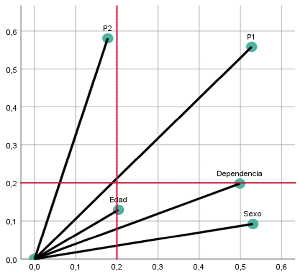 Posteriormente se aplicó un Análisis de Correspondencias Múltiple mediante el uso del software spps (versión 23), lo que permite identificar el nivel de aplicabilidad de cada producción argumentativa del estudiantado y, sobre ella describir el patrón de respuesta predominante en el grupo de estudio (Abascal & Grande, 1989). Sobre cada observación contenida en las dos preguntas focales y, las variables demográficas de la muestra, se obtiene la Figura 3 con un aporte superior al 20% en cada dimensión (las líneas vertical y horizontal definen los límites mínimos por eje), indicando que todas las variables realizan un aporte sustancial y único respecto al fenómeno de estudio. Para comprender mejor el diagrama, utilizamos la notación científica: Preguntas 1 (P1) y Pregunta 2 (P2).