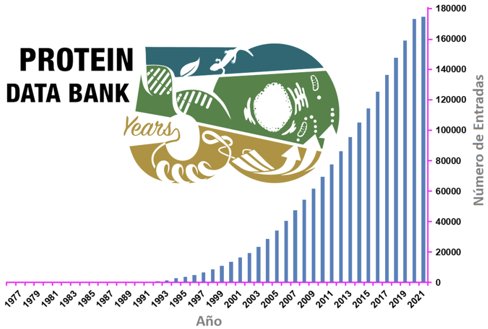 Figura 3. PDB en números: estructuras biológicas disponibles en el archivo hasta el 16 de Febrero del 2021. El número exacto para esta fecha es 174,994 macromoléculas biológicas depositadas (Protein Data Bank, 2021). También se muestra el logo conmemorativo que festeja los 50 años del Protein Data Bank.
