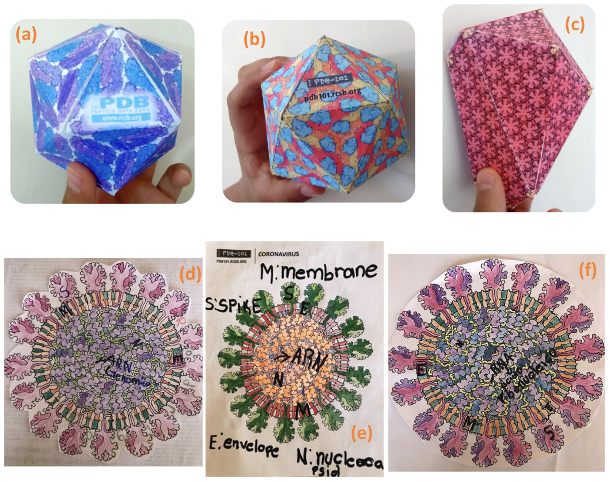 Figura 5. Virus en estilo origami y mandalas del SARS-CoV-2. Ejercicios lúdicos de bajo costo realizados por estudiantes de cuarto y quinto de primaria empleando los recursos educativos que ofrece el PDB-101. Los estudiantes armaron el virus del dengue (a); del Zika con anticuerpos mostrados en azul (b), y de la cápside del VIH (c). También colorearon mandalas del coronavirus (d-f) identificando las principales proteínas virales: S, proteína spike; M, proteína de membrana; E, proteína de envoltura; N, proteína de la nucleocápside. Estas herramientas están disponibles de manera gratuita en el PDB-101 (http://pdb101.rcsb.org/), el portal educativo del RCSB PDB.