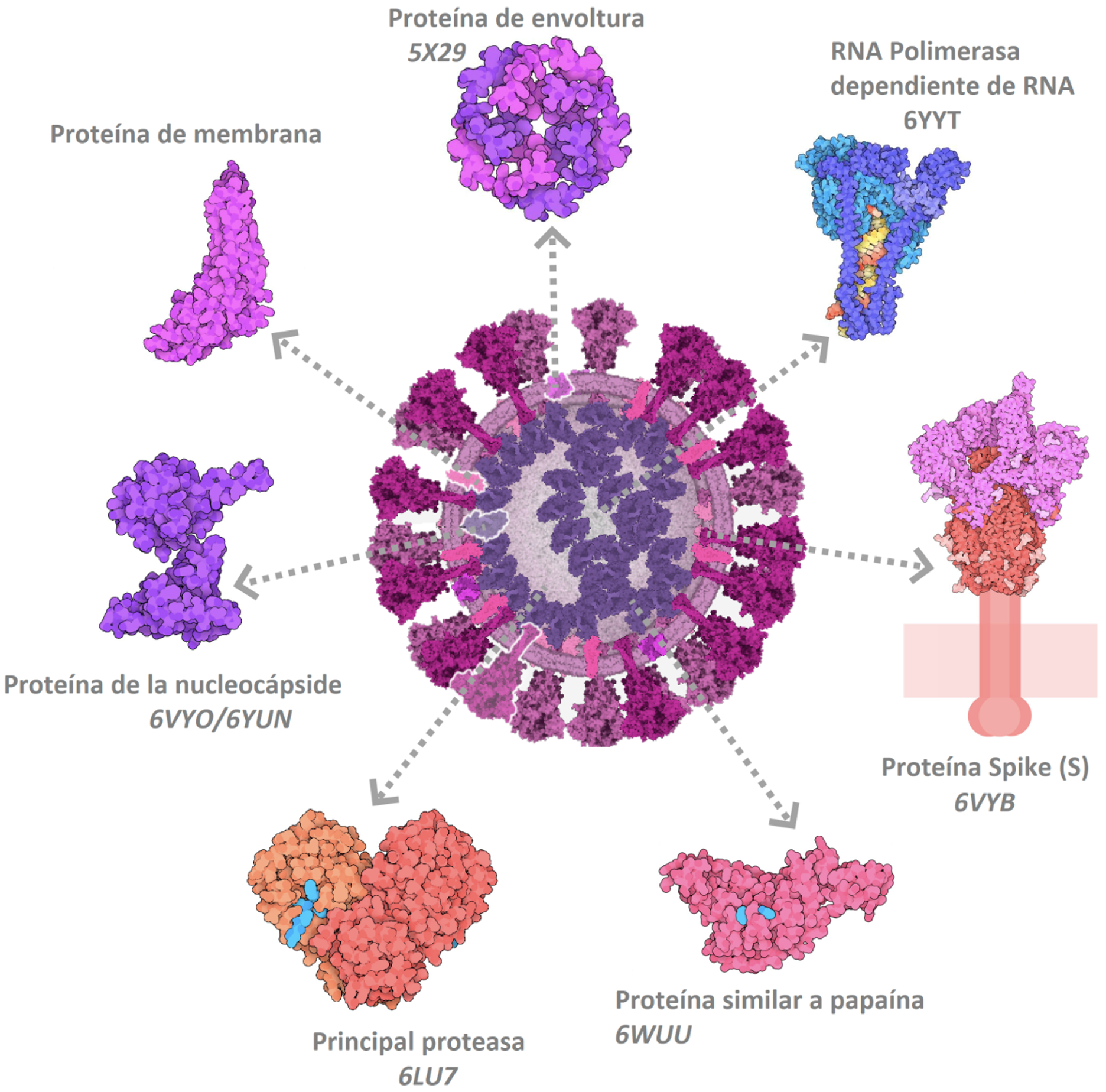 Al igual que los virus SARS y MERS, el SARS-CoV-2—agente causal de la pandemia de COVID-19—es un miembro de la familia de betacoronavirus de ARN que causa enfermedades en mamíferos y aves. Su material genético está escondido y protegido por proteínas que forman la nucleocápside debido a que es el actor protagónico de una serie de eventos moleculares básicos para que el virus prospere. Tan pronto infecta una célula, el virus se encarga de codificar una veintena de proteínas para replicarse (Lubin et al., 2020). La artillería que el SARS-CoV-2 utiliza para infectar una célula huésped se puede resumir de manera general en una polimerasa viral dependiente de ARN, proteínas Spike y enzimas proteasas. Estos sistemas moleculares que constituyen parte de la anatomía del virus, son blancos terapéuticos perfectos para combatirlo (Kearns, 2020). Por lo tanto, su identificación 3D por los biólogos estructurales ha sido una pieza clave para el desarrollo de una potencial vacuna.