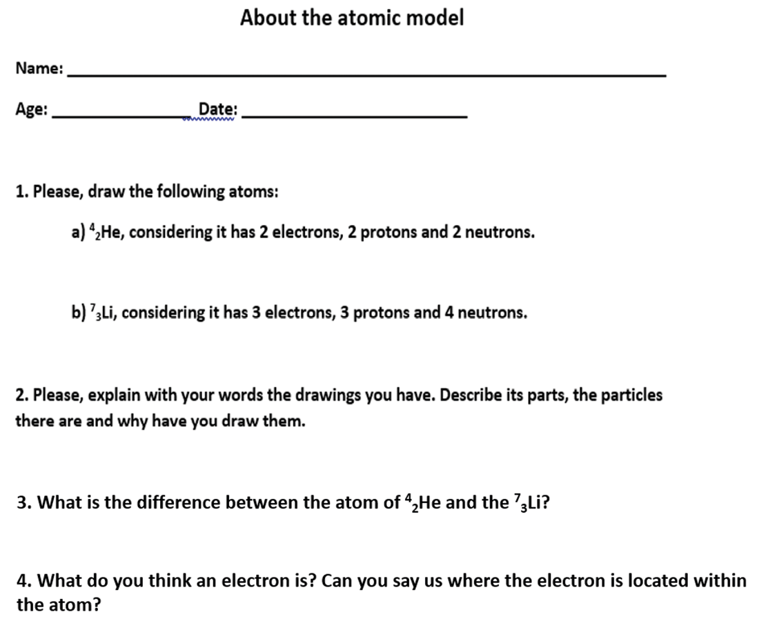 According authors such as Harrison and Treagust (2000), in order to know the mental model of the students the most accurate way is to ask them through tools (like interviews or questionnaires) designed specifically. Attending to the bibliography, to assess the mental model a variety of questions must be asked in order to obtain several types of information. Thus, a semi-structured questionnaire with four questions (including both open and closed) where the students had to: construct explanations, define a concept, argue differences and make representations, was laid out. The students were asked to draw a graphic representation of two different atoms, Helium (He) and Lithium (Li). They had to draw these atoms according to their mental model and to explain their drawings describing the parts they had drawn, establishing the differences between these two atoms and finally, they were asked about what an electron is and where it is located within an atom.