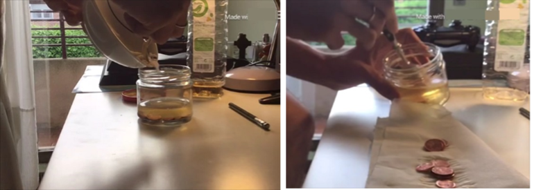 En esta actividad el alumno cubre monedas de cobre con vinagre, después añade sal para explicar la reacción de oxidación-reducción entre el ácido acético del vinagre y el óxido de cobre de las monedas. Por otro lado, la sal actúa como catalizador, haciendo que el proceso sea más rápido. El alumno explica que una consecuencia observable es que las monedas adquieren el brillo metálico característico, como se puede ver en la Figura 3 y en el video.