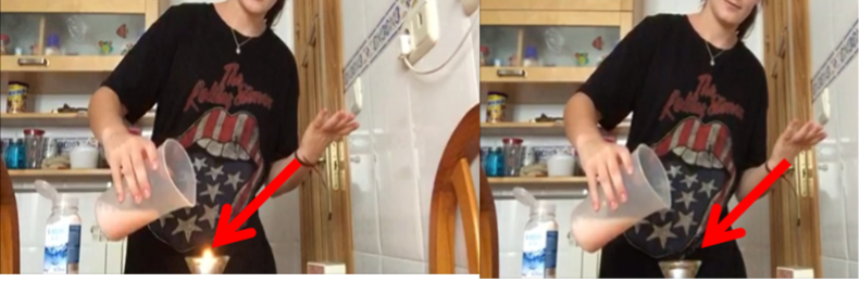 Con esta actividad se trabajan de nuevo la reacción entre bicarbonato de sodio y vinagre en la que se desprende dióxido de carbono gaseoso. Sin embargo, en este caso el sistema es abierto. Ahora bien, debido a que el dióxido de carbono tiene una mayor densidad que el aire, este quedará dentro del recipiente. De esta manera, si volcamos el recipiente levemente sobre una vela encendida, esta se apagará debido al dióxido de carbono (ver Figura 5 y video del desarrollo de la AES).
