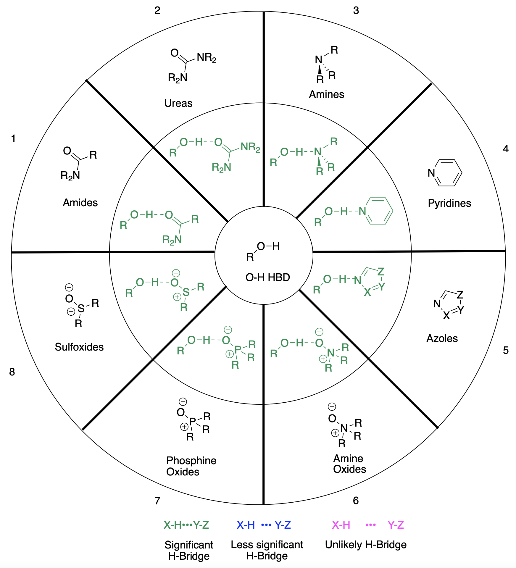 Consider, for example, the O-H HBD-system. If we focus on only this system (Figure 1), there exists functional groups of alcohols (ROH), organosilanols (R3SiOH), phenols (ArOH), organoperoxides (ROOH), carboxylic acids (RCO2H), carboperoxy acids (RCO3H), organosulfenic acids (RSOH), organosulfinic acids (RSO2H), organosulfonic acids (RSO3H), organophosphinic acid (R2PO2H), organophosphoric acids (RPO3H2), organoborinic acids (R2BOH), organoboronic acids (RB(OH)2) organohydroxylamines (R2NOH), hydroxamic acids (R’CONROH), oximes (R2C=NOH) and perhaps even further, more exotic, species. Further sub-divisions might be made based on the identity of R (e.g. aldoxime versus ketoxime) or substitution (e.g. primary, secondary, or tertiary alcohols). Other possible protonated oxygen functional groups (such as protonated carbonyls or protonated amine oxides) might be considered in acidic conditions. Naturally all these possible functional groups are strictly not equal; one must take into consideration the difference in structure (e.g. phenols are not alcohols) and properties (e.g. pKa) among functional groups.