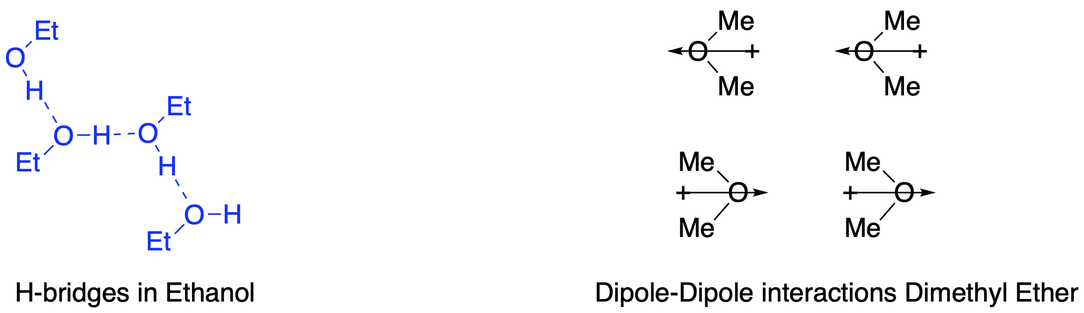 The structural isomers of ethanol and dimethyl ether clearly show the effect of intermolecular H-bridges. Ethanol has a higher bp, mp, and solubility in water compared to dimethyl ether. Some H-bridges (combined with dipole-dipole and London forces, not shown) among several molecules of ethanol are illustrated symbolically in Figure 12, whereas dipole-dipole and London (not shown) interactions are the only forces available to dimethyl ether. Please remind students that while alcohols have both an HBD and HBA, ethers only have an HBA.